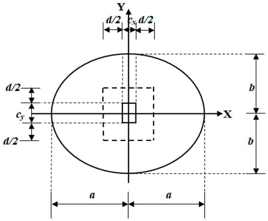 Substituting A = πab, Ix = πab3/4, and Iy = πa3b/4 into Equation (1), the soil pressure is obtained in a general way: