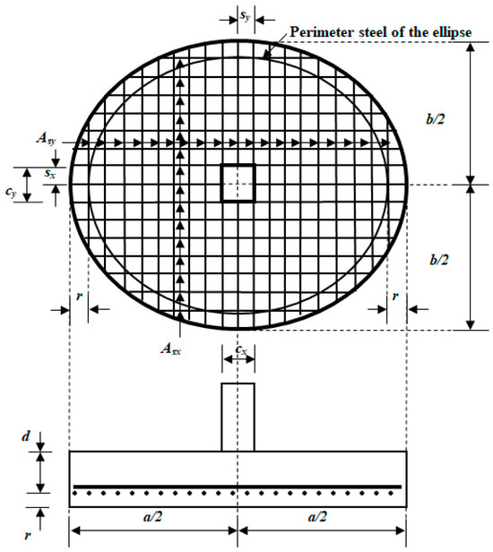 The reinforcing steel of the elliptical footing is obtained as follows. The footing is reinforced orthogonally, parallel to the main axes and an elliptical ring at a distance r (concrete cover in m) from the outer edge.