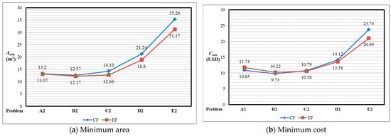 Figure 7 shows the comparison of the minimum area in contact with the ground and minimum design cost between EF (elliptical footings) and CF (circular footings) of example 2 (see Table 4 and Table 5).