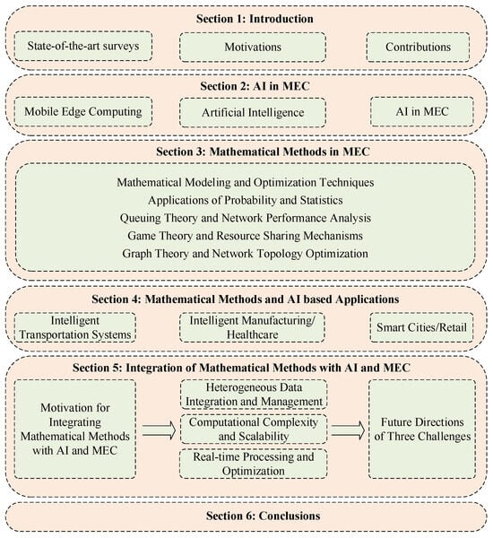 The taxonomy of this paper is illustrated in Figure 1, which provides a conceptual overview of the survey structure. It visually organizes the major sections, including foundational topics, mathematical methods, integrated frameworks, and application domains, thereby helping readers navigate the logical flow of the paper. Section 2 presents the background of AI in MEC. Section 3 reviews mathematical methods applied in MEC. Section 4 discusses AI-based applications supported by mathematical methods. Section 5 explores the integration of mathematical methods with AI and MEC, highlighting key challenges and future directions. Finally, Section 6 concludes the paper.