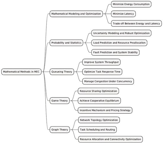 Mathematical methods offer a principled and rigorous foundation for addressing these challenges. Techniques in mathematical modeling and optimization provide formal frameworks for resource allocation, task offloading, caching, and energy management. Probability theory and queuing models enable the characterization of uncertainty and latency, while game theory and graph theory offer powerful tools for modeling multi-agent cooperation and network topology. The taxonomy of mathematical methods in MEC is shown in Figure 4, which categorizes core mathematical approaches along with their targeted objectives in MEC.