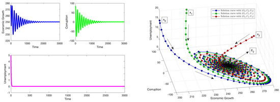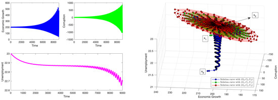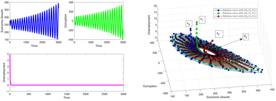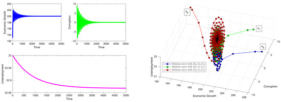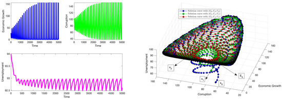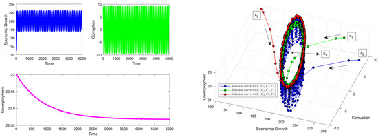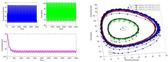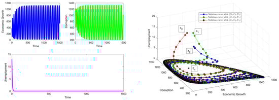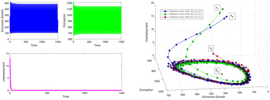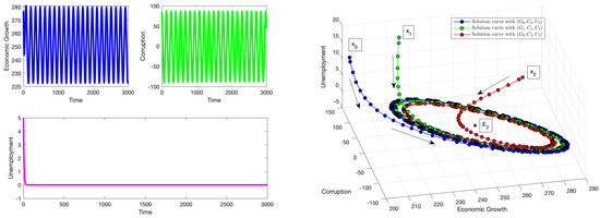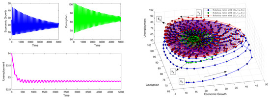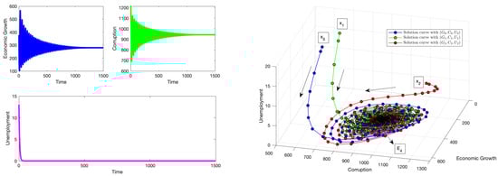 Figure 7 shows the stability of the system (1) for . Trajectories that start near converge to it. This numerically supports the first part of Theorem 8. Note that the solutions remain non-negative despite a relatively large time delay. For , Figure 8 shows the existence of economic limit cycles about the equilibrium point . At this critical value, the delay in the effects of anti-corruption policies coupled with suppressed economic productivity, and inefficient resource distribution, further exacerbate the situation leading to a Hopf bifurcation. There exists a pair of conjugate purely imaginary eigenvalues that cross from the plane to the plane, causing instability. Thus, the second part of Theorem 8 is verified. For , Figure 9 shows that the system presents an economic cycle. Solutions with initial conditions that start near the equilibrium point will diverge from it. This verifies the third part of Theorem 8. Again, note that we obtain non-negative solutions despite using a relatively large time delay. When the time delay increases, the amplitude of the limit cycle increases. This is similar to the theoretical results obtained in [53,54].