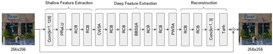 The shallow feature extractor consists of three components: a point-wise convolutional layer transforming the input from 3 to 128 channels, a parametric rectified linear unit (PReLU) activation function, and two residual convolution blocks (RCBs). The PReLU activation [29] is an extension of the ReLU function that introduces a learnable slope for the negative input region, thereby allowing the network to adaptively control the flow of negative information. This flexibility reduces the likelihood of inactive neurons and supports smoother gradient propagation during the early stages of training. The shallow feature extraction module is responsible for capturing low-level spatial features such as edges and textures, which are essential for accurate reconstruction in later stages. Combined with residual learning, this structure helps stabilize early optimization and improves downstream feature learning by preserving fine-grained low-level information essential for artifact removal.
