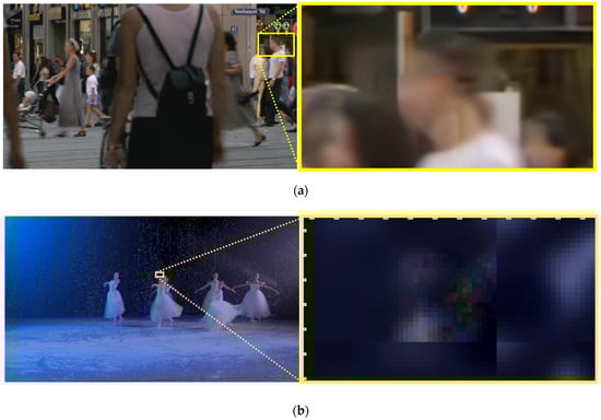 Despite these gains, qualitative analysis of MTSA’s outputs highlighted two key architectural challenges that limited its ultimate visual quality, specifically when processing video compressed at high QP values (e.g., QPs of 55 and 63, corresponding to lower quality and higher compression). These issues were not readily apparent at lower QPs. The first novel challenge was achieving seamless inter-patch continuity. While MTSA effectively reduced AV1 blocking artifacts within its 256 × 256 processing patches, its non-overlapping patch strategy struggled to perfectly harmonize transitions at patch edges under these high QP conditions, frequently resulting in visible seam artifacts as shown in Figure 2a. This also impacted the uniform reduction in blockiness across the entire frame in such scenarios. The second distinct challenge was associated with MTSA’s PWSA module. When processing high QP inputs, MTSA’s outputs occasionally exhibited subtle upsampling-induced pixelation artifacts, appearing as small, block-aligned regions of erroneous pixel values, as shown in Figure 2b. These artifacts, observed in conjunction with the PWSA module’s upsampling stage, proved particularly difficult to resolve with superficial modifications, indicating that more integrated architectural solutions capable of fostering different learning dynamics were required, especially for heavily compressed content. The video frames shown in Figure 2 are taken from the AVM-CTC sequences [5].