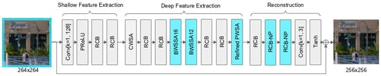 The deep feature extraction module forms the core of the network and is the primary focus of architectural enhancement in this work. The original MTSA architecture employed three complementary self-attention mechanisms—CWSA, BWSSA, and PWSA—interleaved with RCBs to enhance intermediate representations. In the enhanced version, BWSSA is extended to a multi-scale configuration by introducing an additional attention layer operating on 12 × 12 blocks, applied sequentially after the original 16 × 16 BWSSA. This enables the network to better capture both coarse and fine-grained spatial context in a progressive manner. In addition, the PWSA module is modified to include a lightweight convolutional refinement block after the transposed convolution, which helps reduce grid-aligned artifacts and improves continuity across patch boundaries. To support the 12 × 12 block structure while maintaining alignment, the input patch size is increased from 256 × 256 to 264 × 264, providing sufficient coverage for both attention scales.