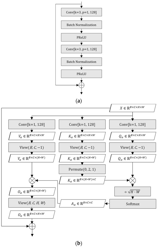The shallow feature extractor consists of three components: a point-wise convolutional layer transforming the input from 3 to 128 channels, a PReLU activation function, and two RCBs. Each RCB, as illustrated in Figure 4a, follows the residual learning paradigm introduced in ResNet [31], and includes two 3 × 3 convolutional layers, each followed by batch normalization layers and a PReLU activation, with a residual connection bridging the input and output. This structure allows the network to effectively extract and refine local features while maintaining stable gradient flow during training. These low-level features provide the foundation for mitigating artifacts introduced by AV1 compression in the subsequent stages of the network.