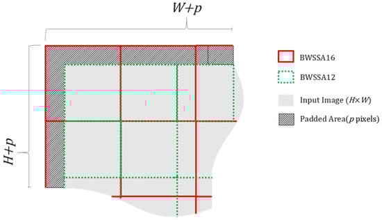 Concurrently, MS-BWSSA with two sequential block sizes (i.e., 16 × 16 and 12 × 12) was introduced. Since these grids are spatially misaligned, their combination was expected to encourage inter-block feature interaction and reduce the reliance on PWSA. Based on this assumption, PWSA was excluded in the initial version of the proposed network.