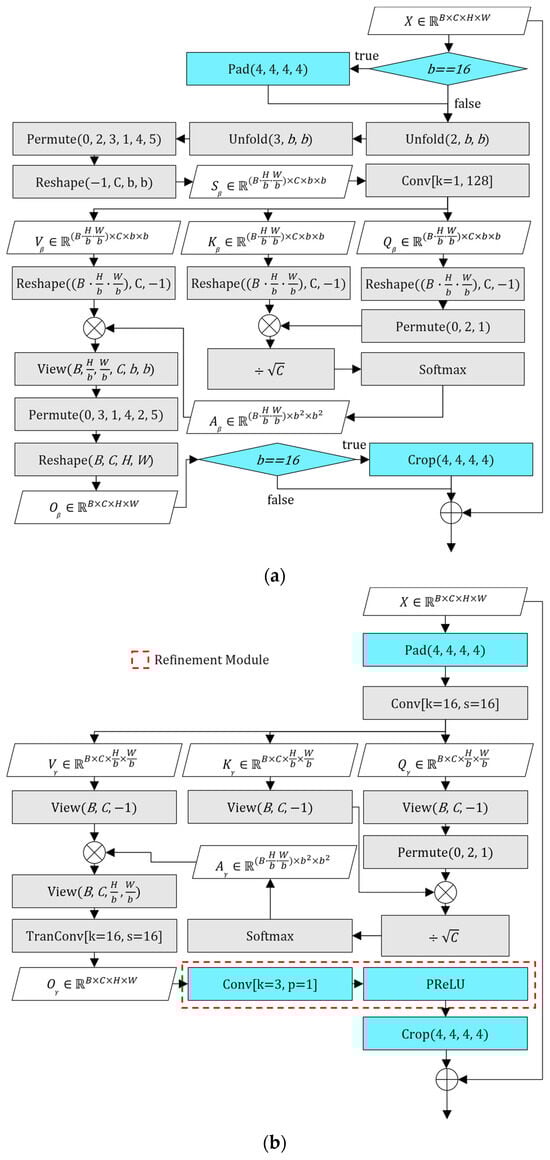 In this equation, represents the patch-wise self-attention computed over 16 × 16 non-overlapping blocks after 4-pixel replicate padding. The ConvTranspose operation upsamples the feature map back to its padded spatial size. RefineConv includes a 3 × 3 convolution and a PReLU activation to suppress artifacts introduced during upsampling. Finally, the padded borders are cropped and the original input Y is added back via a residual connection. Each of these steps is visually illustrated in Figure 6b. The padding is shown at the input stage, followed by attention computation and transposed convolution. The refinement module, introduced in this work, is enclosed by the red dashed box and includes both the 3 × 3 convolution and PReLU activation. The final cropping and residual addition are represented at the output stage, completing the internal flow of the refined PWSA module.