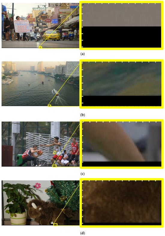 Examples of dark padded regions at the bottom of BVI-DVC sequences. (a) Full frame from a Class A sequence AdvertisingMassagesBangkokVidevo with a zoomed-in view of the bottom yellow-boxed region showing a visually dark 16-pixel row; (b) full frame from a Class B sequence BoatsChaoPhrayaRiverVidevo with a zoomed-in view of the bottom yellow-boxed region showing a visually dark 8-pixel row; (c) full frame from a Class C sequence BasketballGoalScoredS1Video with a zoomed-in view of the bottom yellow-boxed region showing a visually dark 4-pixel row; (d) full frame from a Class D sequence DollsScene1YonseiUniversity with a zoomed-in view of the bottom yellow-boxed region showing a visually dark 2-pixel row.