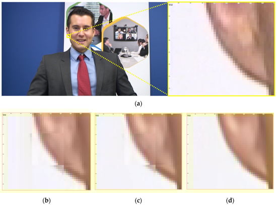 Figure 12 shows a region from the Class A3 Johnny sequence, focusing on a flat background area intersecting the middle of the ear. The AV1-coded image reveals block artifacts along the boundary between the ear and the background, disrupting the smooth transition of the vertical contour. While MTSA Figure 12c reduces some of this AV1 blocking distortion, it simultaneously introduces its own upsampling-induced pixelation artifacts. These pixelation artifacts, manifesting as small, block-aligned regions of erroneous pixel values, leave the edge disconnected and visually unstable. The MS-MTSA output in Figure 12d restores this contour with improved coherence and smoothness, closely matching the original uncompressed frame. This dual improvement is attributed to the combined action of its MS-BWSSA, for better handling of AV1 block boundaries and inter-patch continuity, and its refined PWSA, for mitigating upsampling pixelation. This example further demonstrates the ability of MS-MTSA to preserve fine structural details by addressing both AV1 codec-inherent blocking and MTSA-processing-induced pixelation artifacts in low-texture regions.