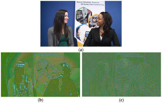 Example sequence from the Class A3 KristenAndSara. (a) Original frame featuring two women in conversation with a poster in the background. (b) Amplified difference image between the AV1-coded frame and the network without PWSA, where dotted blue artifacts appear around gradual intensity transitions such as the background and hair. (c) Amplified difference image from the network with PWSA, where such dotted artifacts are no longer observed.