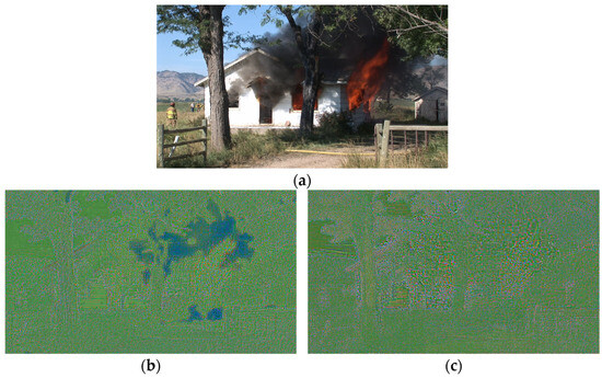 Example frame from the Class A3 ControlledBurn. (a) Original uncompressed image showing smoke emerging from a burning structure. (b) Amplified difference between the AV1-coded frame and the output of the network without PWSA. Difference value shifts are visible in the smoke region, indicating instability in smooth, low-texture gradients. (c) Amplified difference between the AV1-coded frame and the output of the network with PWSA. These structured value shifts are no longer present, demonstrating PWSA’s role in restoring consistency across gradient-heavy, low-contrast areas such as smoke. The difference images in (b) and (c) are shown in amplified YUV color; while green represents general offsets, bluish areas highlight more significant deviations in smooth regions.