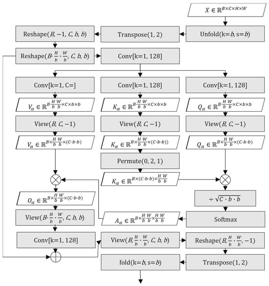 Refined PWSA operates by dividing the input feature map into non-overlapping 16 × 16 blocks using a convolutional layer with a kernel size and stride of 16. To ensure that the entire 264 × 264 input region is evenly divisible by the block size, 4-pixel replication padding is applied to all sides, temporarily expanding the spatial dimensions to 272 × 272. This padding step differs from the original MTSA implementation, where the 256 × 256 input size was already aligned with the 16 × 16 block grid and thus required no internal padding. However, the adjustment made here is not a structural modification but a technical necessity arising from the increased input size used throughout the enhanced network. After attention computation and subsequent processing, the padded margins are cropped to restore the original spatial resolution. The complete MS-BWSSA pipeline—including padding, attention, upsampling, refinement, and cropping—is illustrated in Figure 6b.