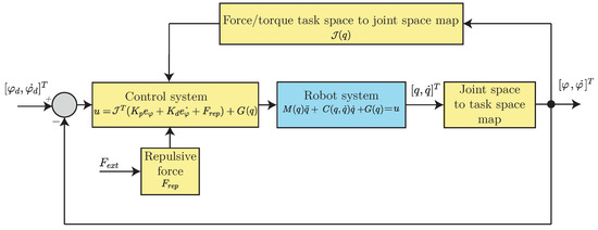 The chosen control system is provided in (2), where are diagonal matrices with the proportional and derivative gains, respectively, the position error vector and the velocity error vector in the task space (Cartesian space) are given by , , respectively, are the position and velocity vectors of the robot’s end-effector in the task space (Cartesian space), are the desired position and velocity vectors of the robot’s end-effector in the task space, is the Jacobian matrix relating the space from to and is the perception of the force exerted by the robot–environment interaction named in this work as the repulsive force vector.