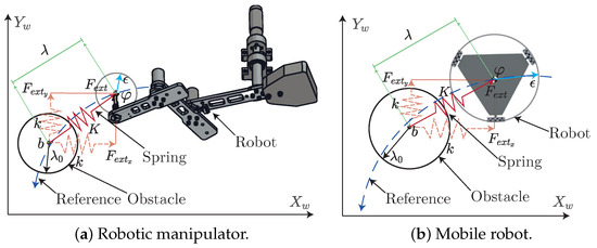 The external resultant force of (force generated by the collision between the robot and the obstacle) is numerically simulated using a spring-like model, as shown in Equation (10). The terms of (10) are described as follows: K is the vector containing the stiffness constant, b is the vector representing the geometric center position of the obstacle, is the robot position in the task space, is the influence distance of the obstacle (circle radius containing the obstacle), is the influence distance of the robot (circle radius containing the robot) and is the distance between the geometric centers of the obstacle and the robot, as illustrated in Figure 2. It is important to point out that the external force is applied () when a collision occurs, i.e., when . Otherwise, when the robot does not collide with the obstacle (the distance is larger than the influence distances and ), there is no external force, i.e., .