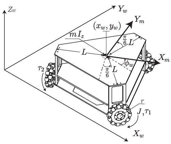 The schematic representation of the OMR is described in Figure 1. The wheel’s location forms an equilateral triangle because this configuration maximizes the dexterity in the task space [50]. The parameters that encompass the mechanical, kinematic, and dynamic aspects of the OMR are listed in Table 1. The OMR is considered under the assumption that it is placed on a flat horizontal surface, with no friction involved, and with non-deformable wheels. Two coordinate frames are considered: , representing the world coordinate frame, and , assigned to the OMR coordinate with its origin at the center of mass, m, and moment of inertia, . An angle of rotates the OMR’s frame concerning the world frame (Figure 3).