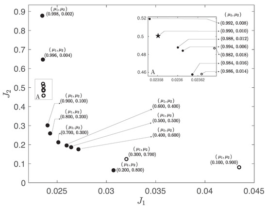 The conditions of the optimization process in the proposed control tuning strategy are presented below. The following five DE variants were selected: DE/rand/1/bin, DE/rand/1/exp, DE/best/1/bin, DE/best/1/exp, DE/current-to-rand/1/bin, as described in Section 3, under the following algorithm parameters: a population size of individuals, evolving over generations, with a crossover coefficient of , a random scaling factor , and the search space bounded by a lower limit and an upper limit . The previous algorithm parameter settings were chosen by analogy [55], adopting values that were successful in similar previous works. Additionally, the weight values and were selected “by hand” [55], where different algorithm parameter configurations are tested, and the most suitable tradeoff is considered. In this particular case, assuming that , initial sweeps of the weight values are performed by varying from to in steps of ( of variation) to identify the region of interest in which the performance function J, composed of the terms (tracking error) and (control effort smoothness), showed promising tradeoffs. Once this region is found, finer sweeps of the weight values are carried out using increments of in within the range ( of variation) to refine the weight selection. This refinement aids in the selection of a weight configuration that offers a favorable compromise between trajectory tracking accuracy and control signal smoothness. Figure 4 presents the sensitivity analysis in the weight variations with respect to the terms and of the performance function J. The filled circle represents the Pareto solutions (PSs), whereas the open circles are solutions that the PSs dominate. The star denotes the PS selected. This figure illustrates that increasing improves tracking accuracy at the expense of control smoothness, and vice versa. The chosen weight configuration reflects a deliberate preference toward minimizing the tracking error while maintaining acceptable smoothness in the control effort. This analysis not only validates the chosen weight values but also supports the effectiveness of the proposed scalarization strategy in balancing the performance function terms.