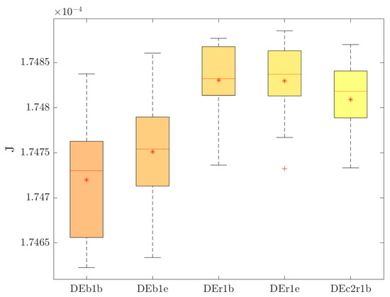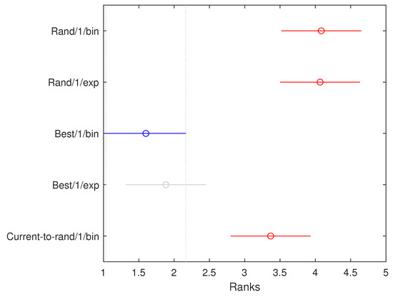 Table 3 presents the descriptive statistical results of the thirty executions of five variants of the DE algorithm. The first column indicates the algorithm variant used in each case. The following columns show the summary statistics obtained. From the second to the fifth column, the results for the best, worst, average, and standard deviation of the thirty executions per algorithm are presented. The best result for each criterion is highlighted in bold. The graphical representation of the descriptive statistics is also presented in Figure 5. To generalize the results obtained, inferential statistics are applied to confirm the performance of the algorithms through a multiple comparison test [56]. Before using the test, it is essential to ensure that at least two samples (sets of thirty executions in the group of five sets provided by each DE variant) have different ranks, i.e., the Friedman test can detect differences between at least two samples. In this particular case, the p-value is , indicating the existence of significant differences. So, once this is confirmed, the Bonferroni multiple comparison post hoc test with a significance level would confirm the algorithm performance among them. The multiple comparison test is shown in Figure 6. Lines overlapping indicate no significant difference between the algorithms; i.e., no inference about the data distributions can be made, as the p-values in those comparisons are larger than the chosen significance level. In contrast, algorithm results that vary significantly from each other do not have overlapping red lines, meaning that the p-value is below the chosen significance level. The winner is the algorithm closest to the left in the rankings (x-axis in the figure). Figure 6 compares one of the most promising algorithms (DE/best/1/bin) with the rest of them. Algorithms different from the DE/best/1/bin are depicted in red lines, whereas gray lines indicate algorithms that are not significantly different.