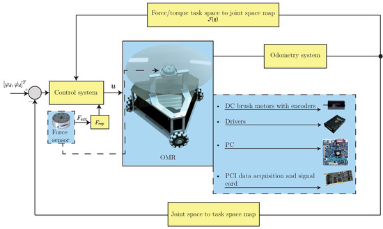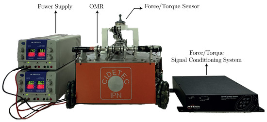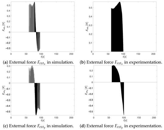 In this section, the proposed CTEwREI is validated using an actual force system in place of the virtual sensor. This additional experiment corroborates the CTEwREI performance with other external force behaviors and shows if the obtained gains are also suitable for robot–environment interactions. The external force is provided in the mass center of the OMR, as is observed in Figure 9.