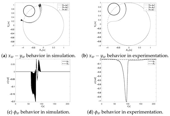 The simulation time interval spans from to s with an integration time of ms. During this period, the OMR must follow a circular trajectory (22) with a center at the origin, a radius of m and a frequency of Hz. The initial condition vector of the OMR is set as . The circular obstacle (23) is located in the Cartesian coordinate with an influence distance . Regarding the repulsive force described by (9), the diagonal elements of the matrix are set to . The stiffness constant of the spring that emulates the associated external force is given by with and the robot’s influence distance m.