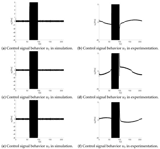 Simulation and experimental behavior of the control signal of the OMR with the controller gains obtained via CCTA.
