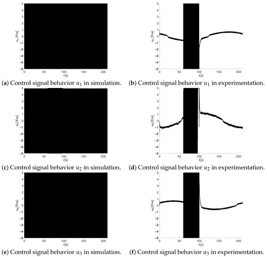 - The control signals of the proposal in the simulation are significantly smoother than the CCTA, as indicated in the ISDU column of Table 6 with a reduction of . This is also visualized in Figure 14, where the control signals commute between their limits. The lack of control smoothness in the controller tuning formulation of the comparative controller tuning approach could have an impact on the high vibration of the OMR and an increase in energy consumption. In the case of the experimental result, the reduction of the control signal is .
