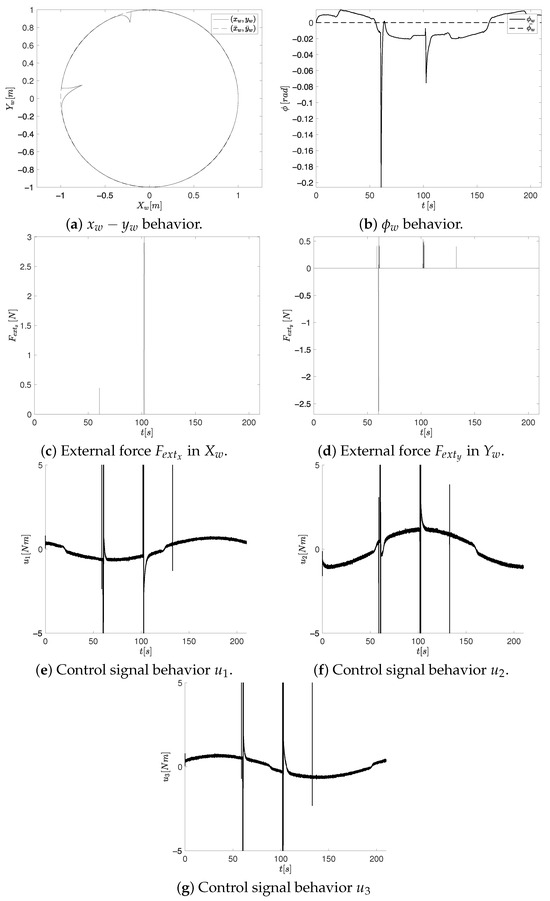 Under the same CTEwREI gains, trajectory, and sample time, the additional experiment involves applying external disturbances at two distinct time instants. Figure 16 displays the OMR’s position behavior, the control signal, and the external force.