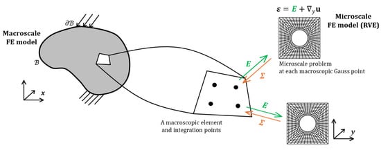 As illustrated in Figure 1, the FE2 method divides a given model into two scales, a macroscopic domain and the microscopic domain , and simultaneously analyzes in two different scales. To this end, the boundary value problems (BVPs) of both scales should be satisfied, as expressed in Equations (4) and (5):