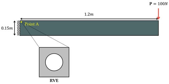 As shown in Figure 2, a concentrated load was applied to the top right edge of the beam consisting of a heterogeneous RVE model. We applied fixed boundary conditions for the left side of the beam. For finite element analysis, we constructed a macroscopic model using 240 elements and 287 nodes and an RVE model using 440 elements and 484 nodes. The material constants of the RVE model were and .