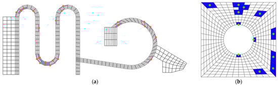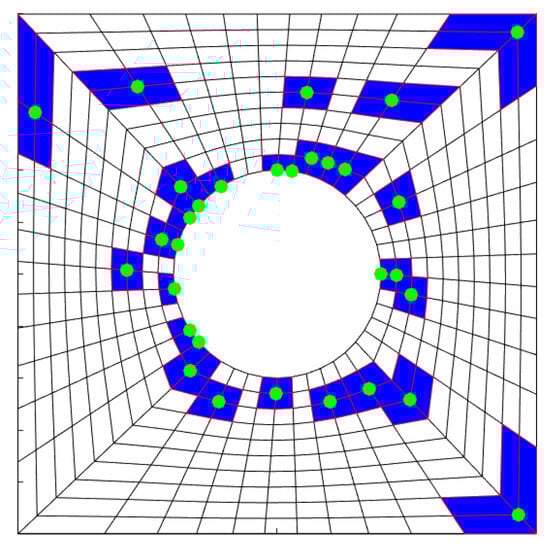 Information on the ROM is shown in Table 2 and Figure 3. The ‘#’ sign inside the table indicates a number. As shown in Table 2, the size of the reduced RVE model is about 3.3% compared with that of the FOM. In Figure 3, the green points are the ones selected for the DEIM interpolation by Algorithm 1, and the blue elements with red edge line represent the ones that contain the nodes of the DEIM points. We considered only the blue sample elements in the online stage out of the full elements.
