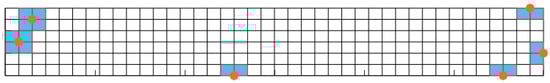 To construct ROMs, we applied the same procedure as in example 1 in the offline stage. The sample parameters for the parametric study of the RVE model are also the same as Table 1. The ROMs information is shown in Table 5 and Figure 10. Table 5 shows the information on the system size for the macro- and microscopic ROMs. Figure 10 plots the location information of the selected point applying the DEIM. In Figure 10a, which is the macroscopic ROM information, the orange points are the DEIM points, and the sky-blue square of red edge line represents the sample element associated with the orange points. In Figure 10b, which is the microscopic ROM information, the green points are the DEIM points, and the blue square of red edge line represents the sample element. The ROM 1 and ROM 2 have about 1.4% and 1.9% of the size of the FOM, respectively.