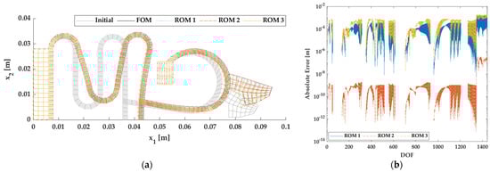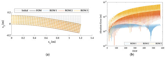 Results of beam model using ROMs: (a) deformation of FOM and ROMs; (b) absolute error of displacement depending on all DOFs.