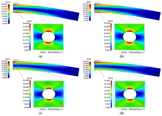Distribution of macroscopic von Mises stress and microscopic von Mises stress at point A: (a) FOM; (b) using ROM 1; (c) using ROM 2; (d) using ROM 3.