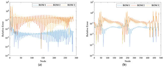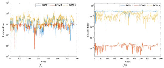 Figure 12 presents the distribution of the von Mises stress. As per the von Mises stress distribution of the macroscopic domain, the von Mises stress distribution of the RVE model indicates similar results to the FOM. As illustrated in Figure 13, the ROMs exhibit a relative error of less than 3.2 and 0.14 in the macroscopic and microscopic domains, respectively.