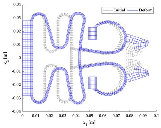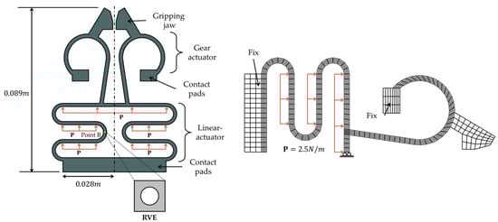 The second example is a microgripper model [48] with a load applied at the linear actuator surface, as illustrated in Figure 8. When a load is applied to the microgripper, the gripping jaws open, and the microgripper is ready to grab an object. Due to the symmetry with respect to the horizontal axis in Figure 9, we considered only half of the macroscopic domain in the FE2 analysis. The contact pads applied fixed boundary conditions. The macroscopic model consists of 579 elements and 722 nodes, and the RVE model has 432 elements and 480 nodes. In this example, the material constants of the RVE model were and , which are referenced from [7]. We performed the computations of this example using a parallel computing process in MATLAB.
