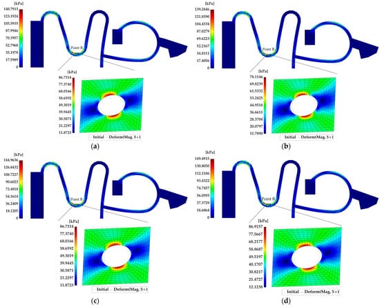 Distribution of macroscopic von Mises stress and microscopic von Mises stress at point B: (a) FOM; (b) using ROM 1; (c) using ROM 2; (d) using ROM 3.