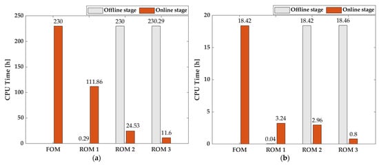 Regarding the efficiency evaluation of the proposed method, Table 6 represents the computation time of each model. The online computation time of ROM 1 was about 5.7 times faster than the FOM, and ROM 2 was about 6.2 times faster than the FOM. ROM 3 was about 23 times faster than the FOM. Whereas ROM 3 has similar accuracy to ROM 1, it shows the highest computational efficiency among the ROMs. Figure 14 compares the CPU time of each ROM, including the offline stage. Although ROM 1 shows much less offline time than ROM 2 and 3, its applicability is limited to a single RVE model, and the online efficiency is not more competitive than the others. ROM 3 shows the highest efficiency, but it could be less accurate than the other two ROMs because the data loss is greater. In particular, ROM 2 is more efficient than ROM 1 from an online stage perspective. However, since at least one full FE2 analysis is required to build ROM 2, the computational cost of the offline stage is high. Considering that the proposed method can be extended to a parametric ROM, which was extensively investigated for various linear ROMs with large-scale systems [49,50] and actively extended to nonlinear models [51,52], ROM 3 is the most appropriate compared to the other two ROMs since its online efficiency is superior to achieve a real-time, or near real-time, performance.