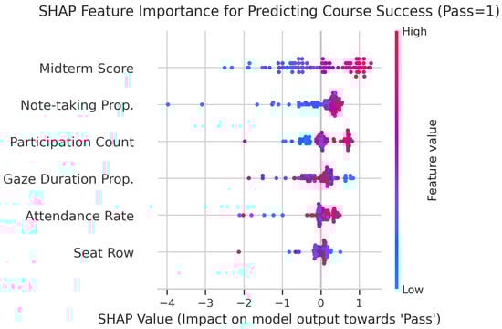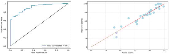 Performance was evaluated using standard metrics. For the classification task (Pass/Fail): Accuracy, F1-score, and Area Under the ROC Curve (ROC-AUC). For the regression task (Predicting exact score): Mean Squared Error (MSE), Mean Absolute Error (MAE), and Coefficient of Determination (R-squared, ). The formulas for these metrics are standard and defined as follows: Accuracy ; F1-score ; ROC-AUC is the area under the Receiver Operating Characteristic curve; MSE ; MAE ; . TP, TN, FP, and FN represent True Positives, True Negatives, False Positives, and False Negatives; n is the number of test samples; is the true value; is the predicted value; and is the mean of the true values.