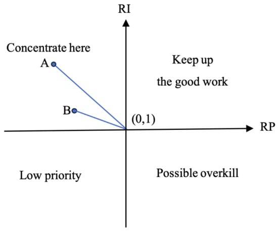 The concept of importance-performance analysis (IPA) involves using surveys to understand users’ perceptions of the “importance” and “performance” levels of quality attributes. A two-dimensional matrix of importance and performance levels is then used to categorize these attributes into four quadrants: Keep Up the Good Work, Concentrate Here, Low Priority, and Possible Overkill []. While the IPA model is widely regarded by researchers as a simple tool for performance evaluation and quality management, it also presents certain practical issues in application and decision-making. These issues include the inability to differentiate quality attributes within the same quadrant, the lack of consideration for service gaps, variations in the importance of quality attributes, and subjective conflicts []. Therefore, many scholars have proposed methods for improvement. Among them, our previous work [] introduced the importance-performance and gap analysis (IPGA) model. This model integrates importance-performance analysis (IPA) with service quality gap analysis by replacing the IPA model’s coordinate axes with relative importance (RI) and relative performance (RP). Similar to the traditional IPA model, the IPGA model divides resource allocation into four quadrants with different strategic implications.