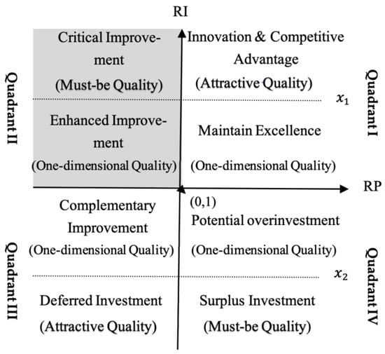In the KIPGA model, this study first employs a moderated regression model to identify the Kano two-dimensional quality categories. Next, based on their classification within the Kano model, mutual information (MI) is introduced to calculate the relative importance (RI) value. At the same time, the original IPGA model is used to compute the relative performance (RP) value. Finally, the obtained coordinates are used to plot the KIPGA matrix, which is then divided into eight different regions, each assigned a distinct management strategy. Based on the analysis from the implementation steps of the KIPGA model, this study categorizes the KIPGA matrix into the following eight categories: (1) innovation and competitive advantage (upper region of Quadrant I); (2) maintain excellence (lower region of Quadrant I); (3) critical improvement (upper region of Quadrant II); (4) enhanced improvement (lower region of Quadrant II); (5) complementary improvement (upper region of Quadrant III); (6) deferred investment (lower region of Quadrant III); (7) potential overinvestment (upper region of Quadrant IV); (8) surplus investment (lower region of Quadrant IV).