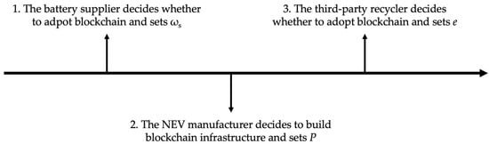 We assume that the recycler’s green investment cost is , where , and is the cost factor for green recycling, following the related references [,]. We assume that the batteries of the new energy vehicles sold by the NEV manufacturer cannot be fully recycled, and the level of green investment of the third party has an impact on the number of batteries recycled; thus, the number of batteries recycled is []. If the NEV manufacturer decides to adopt blockchain technology, we assume the NEV manufacturer will bear the cost of the blockchain infrastructure. The battery supplier and the third-party recycler must pay a unit cost to the NEV manufacturer for adopting blockchain technology. Table 2 shows all the notations in this paper.