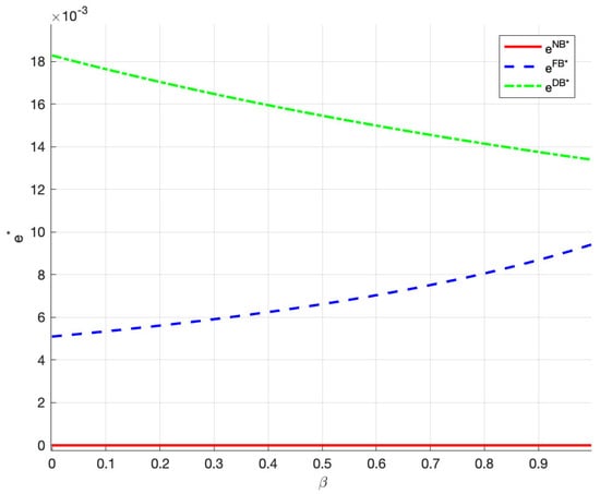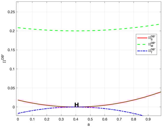 We use the subscript DB to represent the forward–reverse blockchain traceability scenario. In the DB situation, the NEV manufacturer will invest in basic blockchain technology, and both the battery supplier and the third-party recycler will adopt blockchain traceability. Through the NEV manufacturer, consumers can obtain all the information about the NEVs from production to sales, and becomes 0. Moreover, the third-party recycler can accurately identify the remaining battery capacity of used batteries. The echelon utilization rate of the used batteries k becomes 1. However, when the third-party battery recycler chooses to adopt blockchain technology, the information about consumer privacy will be disclosed to the third-party battery recycler, such as the battery usage frequency, charging times, mileage, and driving habits. Consumers will suffer a privacy cost, denoted as [], due to the use of blockchain.