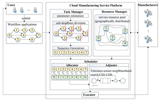 The systematic framework for workflow scheduling in cloud manufacturing is illustrated in Figure 1. It involves three major entities: Users, Cloud Manufacturing Service Platform, and Manufacturers. Users submit workflow applications via the platform’s interface, where each workflow consists of a series of heterogeneous sub-tasks with partial-order constraints and varying workloads. Upon submission, the Task Manager analyzes the user’s request, performs fuzzy time parameter estimation for each task, divides the overall deadline into fuzzy sub-deadlines, and generates a task scheduling sequence. Inputs of the Task Manager are Workflow DAG and soft deadline D. The output of the task manager is fuzzy sub-deadlines . Simultaneously, the Resource Manager oversees a geographically distributed and heterogeneous service resource pool, calculates fuzzy execution times and interresource logistics costs, maintains up-to-date information on resource availability and workload, and provides these data in real time to the scheduler. The scheduler comprises two components: the Allocator, which assigns resources to tasks based on the predefined sequence and a matching strategy, and the Adjuster, which refines the schedule using a tolerance-aware neighborhood search algorithm to minimize total workflow delay. The input of the Allocator is task sequence. The output of the Allocator is resource assignments . Finally, the Executive implements the optimized schedule and provides execution feedback to both users and service providers.