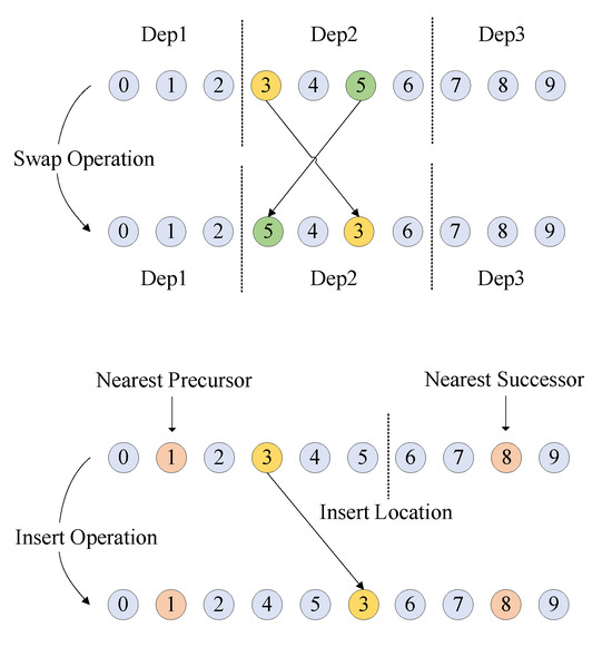 The improvement of the initial solution is implemented based on the neighborhood search algorithm, where the neighborhood structure is crucial for the algorithm’s search trajectory because it determines the topological properties of the search space. Generally, swapping and insertion are two basic operations of neighborhood search algorithms. In the workflow scenario studied in this paper, where tasks have complex partial order constraints, operations cannot be completely random insertions or swaps. Instead, they must be conducted under certain rules, and their execution processes are shown in Figure 2. The swap operation involves randomly selecting two tasks at the same depth and exchanging their positions to generate a new sequence of tasks. Meanwhile, the insertion operation involves randomly selecting and removing a task and then randomly choosing a position between its closest predecessor and successor to insert the task.