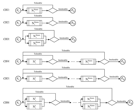The tolerance-aware composite heuristic neighborhood search further optimizes the scheduling scheme, deploying neighborhood structure construction operators to enhance the diversity of neighborhood solutions. It uses the value k to limit the size of the search space and introduces the concept of tolerance to ensure reasonable search boundaries. Based on the three neighborhood structure construction operators and the two neighborhood search methods proposed before, six composite neighborhood structures were constructed, and six corresponding composite heuristic neighborhood search methods were developed. The schematic diagram of the six composite heuristic algorithms is shown in Figure 6.