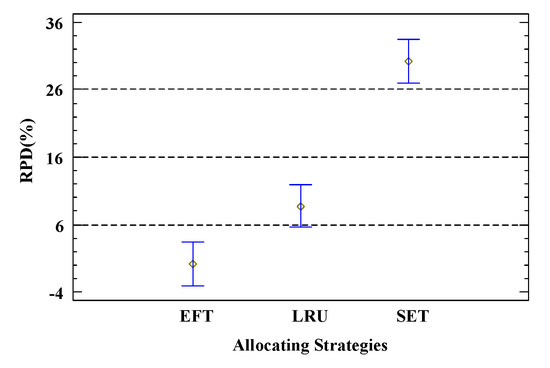 Figure 8 shows the results of different search and matching strategies of services. The RPD value of EFT is close to 0, LRU fluctuates between 5 and 14, and SET fluctuates between 26 and 36, with EFT clearly performing better. Although EFT does not directly consider balancing the utilization rate of different service resources compared to LRU, it selects from idle service resources without causing significant congestion. Additionally, compared to SET, EFT considers the impact of logistics time on total delay on top of execution time. Therefore, EFT is chosen as the strategy for the search and matching component of the service.
