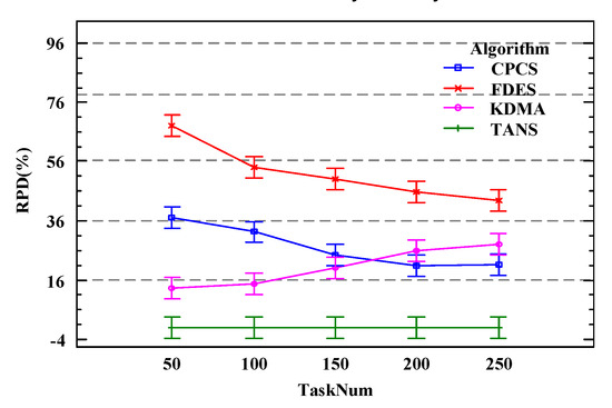 Figure 13 shows the results of the comparison of the RPD values for the total delay of the workflows under different task quantities for four algorithms within the 95% Tukey HSD confidence interval. Across various workflow task sizes, the TANS algorithm proposed in this chapter consistently outperforms the other comparative algorithms. The performance of the KDMA and CPCS algorithms varies with the number of tasks. FDES performs the worst due to its lack of consideration for a global strategy. When , the RPD values for KDMA are lower than those for CPCS; when , the RPD values for CPCS are lower than those for KDMA. This is because with fewer tasks, the workflow structure is simpler, and the clustering scale is smaller and less effective, showing no advantage over the list scheduling algorithm KDMA. As the number of tasks increases, the workflow topology becomes more complex and the scale of tasks included in the critical path increases. At this point, using a clustering algorithm that can map all tasks on the critical path to the fastest service resource en masse without considering the logistics process performs better. Overall, the optimization effect of TANS is significant, outperforming the other three algorithms in terms of total workflow delay in any task size scenario.