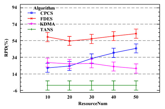 Figure 14 shows the results of the comparison of the RPD values for the total delay of the workflows under different numbers of service resources for four algorithms within the confidence interval 95% Tukey HSD. Under various quantities of service resources, the KDMA proposed in this chapter consistently outperforms the three comparative algorithms. The RPD values for FDES are always higher than those for the other three algorithms, maintaining a generally flat trend with a slight decrease in fluctuation at . The inferior performance of FDES may be due to its scheduling approach, which only focuses on the current ready-to-schedule tasks without considering the priority sequence of all tasks included in the workflow from a global perspective, leading to sub-par performance in static scheduling. TANS shows the most significant advantage over the other three, with its RPD values on average 24% lower than KDMA, 32% lower than CPCS, and 60% lower than FDES. Therefore, it is evident that under different scenarios of quantity of service resources, the TANS algorithm proposed in this chapter performs the best, capable of reducing total workflow delay by an average of approximately 39% compared to other comparative algorithms.