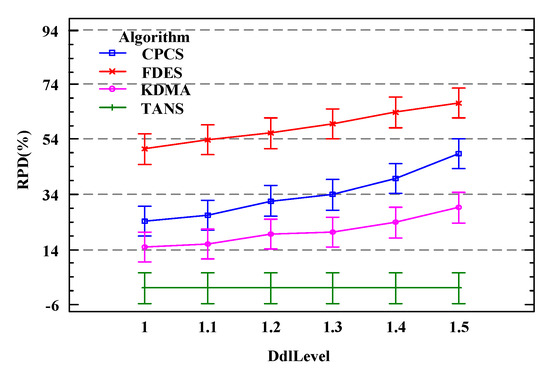 Figure 15 shows the results of the comparison of the RPD values for the total delay of the workflows under different deadline factors for four algorithms within the 95% Tukey HSD confidence interval. As the deadline factor increases, the RPD values of KDMA, CPCS, and FDES all show an upward trend. When , the RPD values of KDMA, CPCS, and FDES reach their maximum at 22%, 50%, and 64%, respectively. From the analysis above, it is evident that with changes in the deadline factor, either under tight or relaxed workflow deadline constraints, TANS shows better results compared to the other three algorithms, effectively reducing the total workflow delay by an average of 35%. Furthermore, when the deadline is tight, that is, , the total delay of the optimized scheduling scheme provided by TANS is approximately 14% lower than that of the initial scheduling scheme; when the deadline is more relaxed, that is, , it is about 22%.