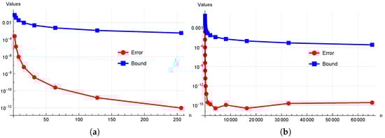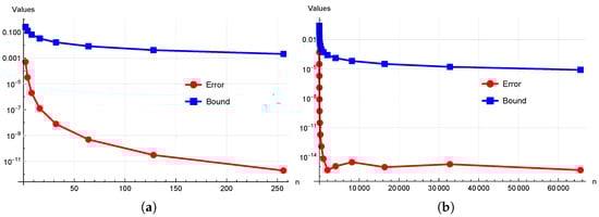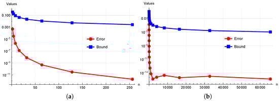 Let be a function defined as . The derivative of the function is , which is continuous and convex over . The performance and efficiency of the newly proposed error bounds in Theorem 1 for the composite Simpson’s formulas is clearly demonstrated in Table 2. The data indicate a significant reduction in the error bounds with increasing value of partitions n. Notably, as n becomes sufficiently large, the error bound of the composite Simpson’s formula approaches zero, which is clear from Figure 2. In Figure 2, the blue line represents the error bound, and the red line represents the error of Simpson’s formula. Furthermore, the table highlights that Simpson’s formula attains its order of convergence, which is 4.